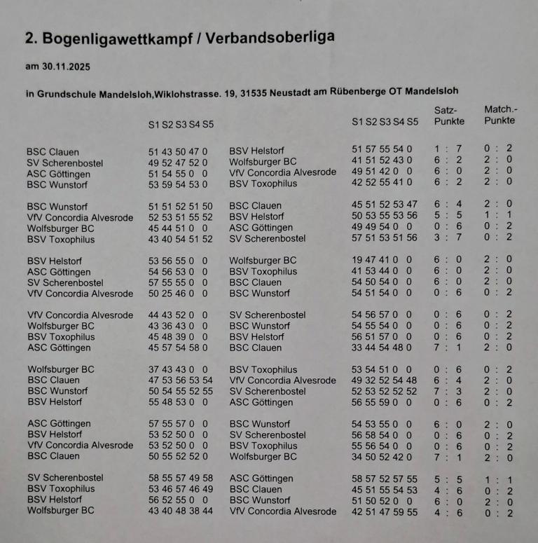 Am 30.11.2025 wurde in Mandelsloh der 1. und 2. Wettkampf in der Verbandsoberliga A Recurvebogen ausgetragen. Die Ligamannschaft des BSC Wunstorf landete am Ende des Tages auf dem verdienten 3. Platz.