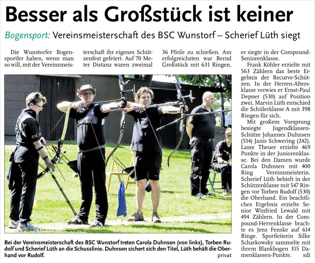 Bei der am 23./24.07.2016 in Wietze ausgetragenen Landesverbandsmeisterschaft Bogen im Freien belegte die 1. Sportleiterin Silke Scharkowsky in der Klasse "Damen Blankbogen" mit 464 Ringen den 1. Platz (bei 8 Starterinnen) und holte somit den Titel der Landesmeisterin 2016 nach Wunstorf.