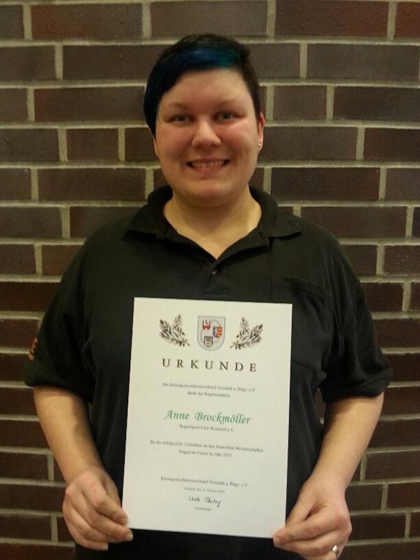 Während der Delegiertenversammlung des Kreissportschützenverbandes Neustadt a. Rbge., die am 21.02.2016 in Garbsen stattfand, wurde Anne Brockmöller für ihre Teilnahme an der Deutschen Meisterschaft Bogen im Freien (Compoundbogen) 2015 geehrt. Wir freuen uns mit unserer Vereinskameradin und gratulieren zu dieser Auszeichnung.